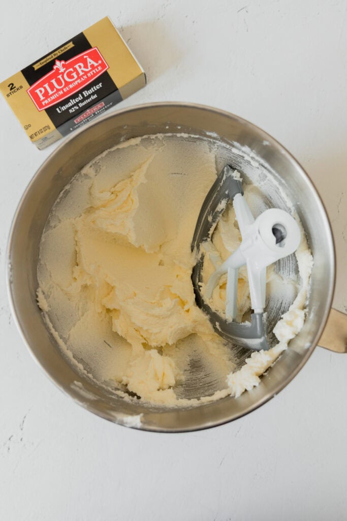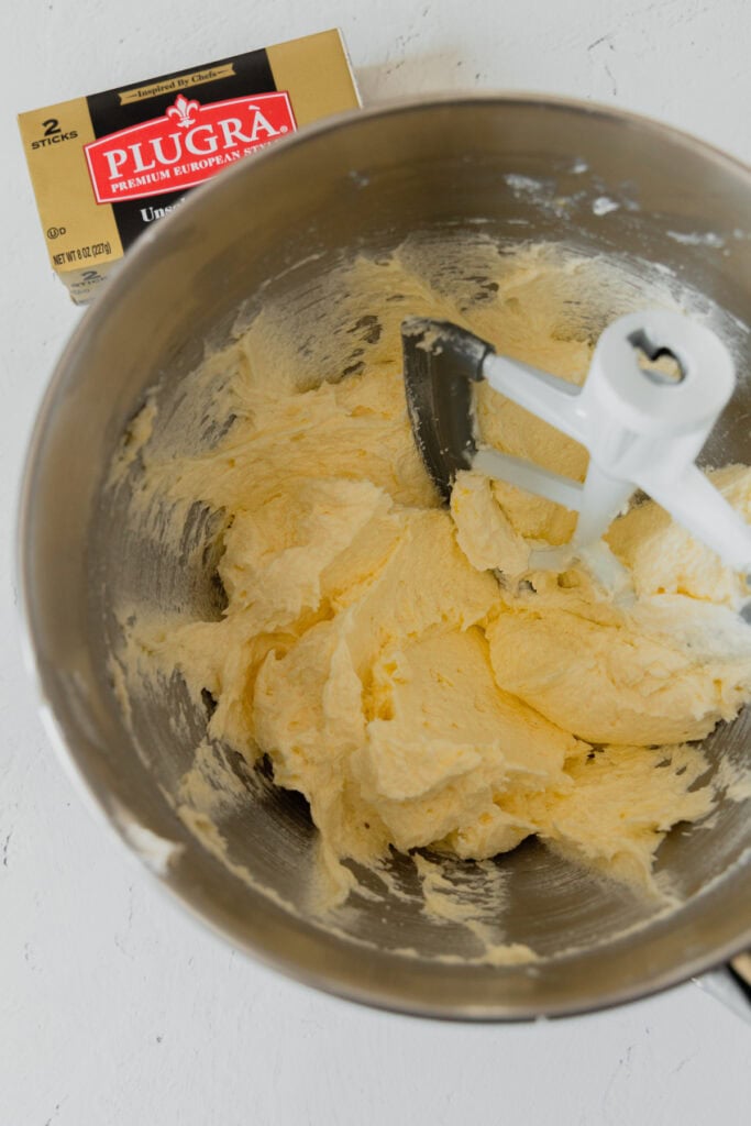 - In the bowl of a stand mixer fitted with the paddle attachment, cream together 1 ¼ cups granulated sugar and 1 cup (2 sticks) unsalted Plugrà butter until light and fluffy, about 5 minutes.