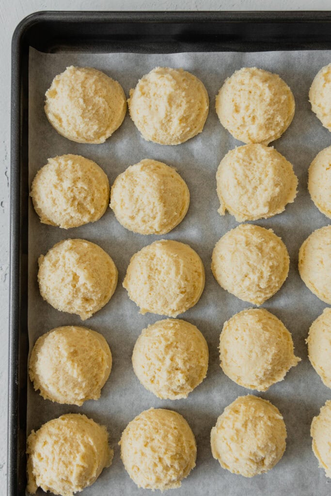 - Using a medium cookie scoop, portion the dough out onto a baking tray lined with parchment paper. These portions can be right next to each other, as we aren’t baking them yet, just chilling!