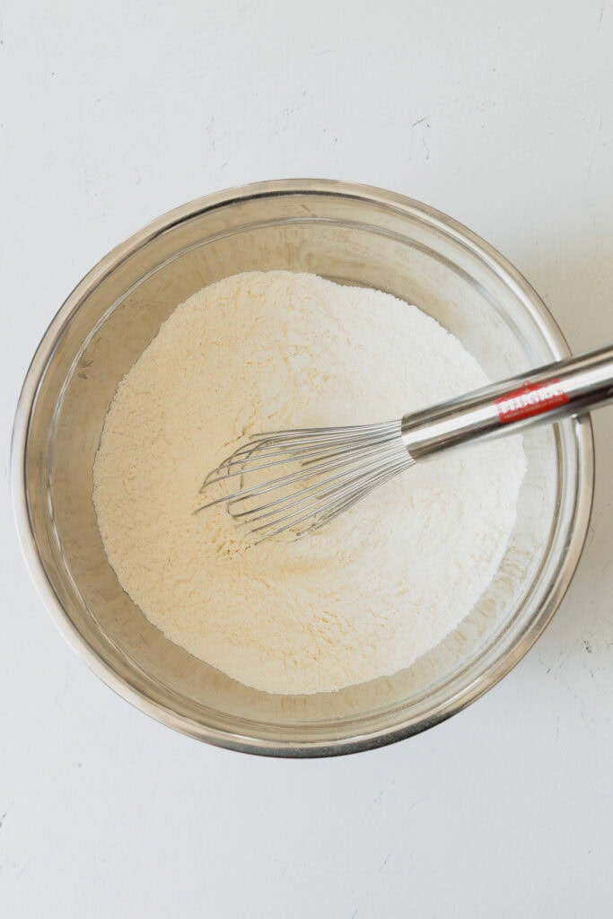 - In a small bowl, whisk together 2 ¾ cups flour, 1 teaspoon baking soda, ½ teaspoon baking powder, and ½ teaspoon salt. Set aside.