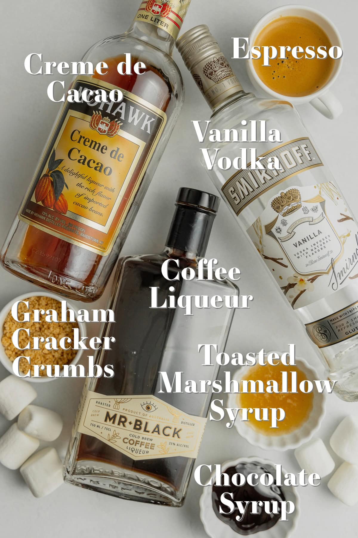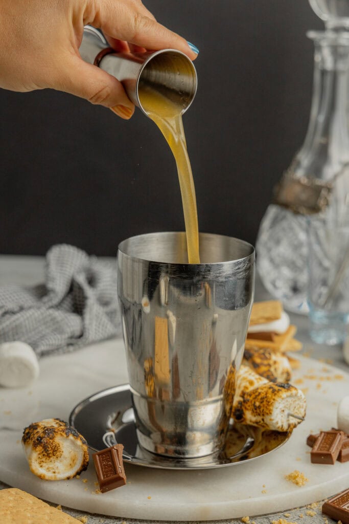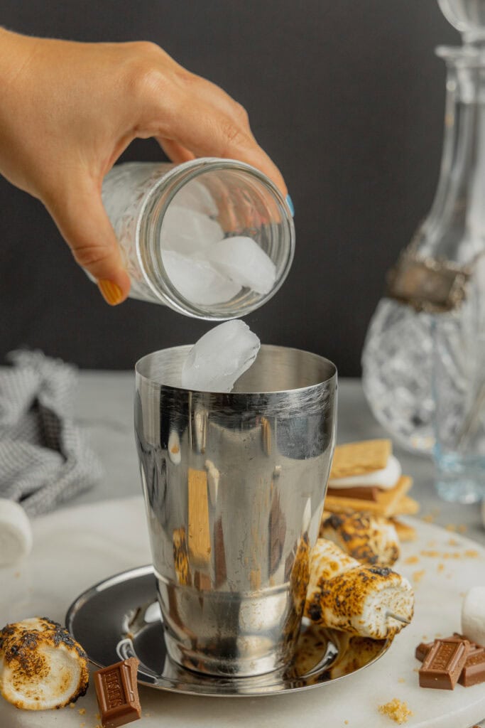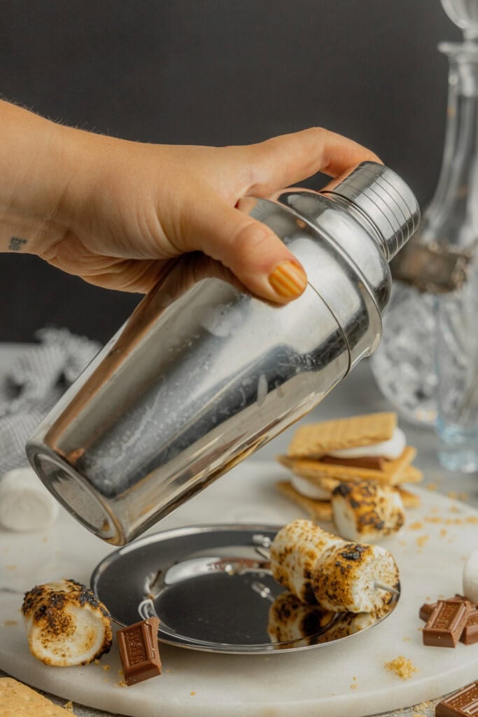 - Add 2 ounces of vanilla vodka, 2 ounces freshly brewed espresso, 1 ounce coffee liqueur, 1 ounce crème de cacao, and 1 ounce toasted marshmallow syrup to a cocktail shaker. Add a generous handful of ice to the shaker.