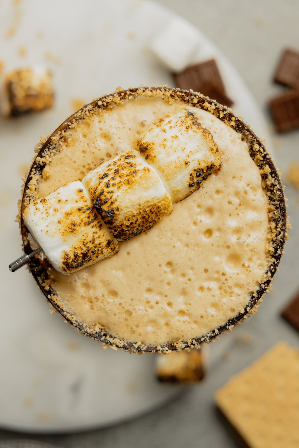- Prep your serving glass by rimming it in chocolate sauce and coating it in crushed graham cracker crumbs, if desired. Set aside. Stack toasted marshmallows on a skewer and set aside.